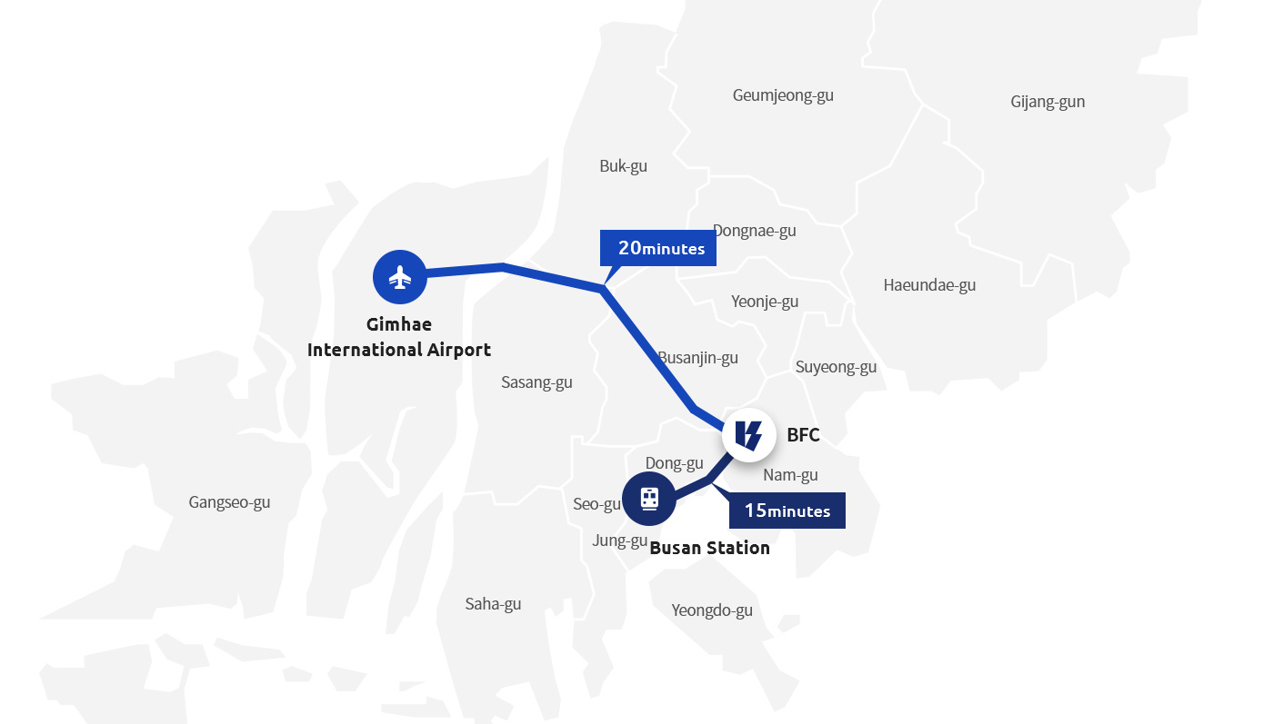 From Busan International Finance Center (BIFC) to Busan Station 15M by car, 30M by subway