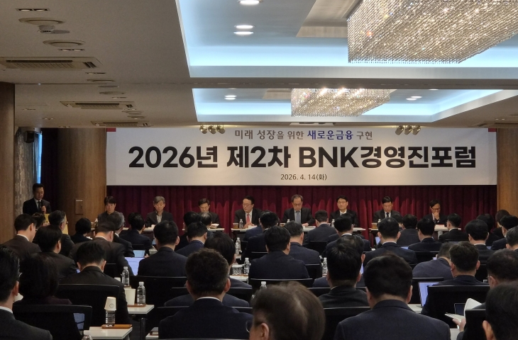 이명호 부산국제금융진흥원장은 2026년 4월 14일(화), BNK금융그룹 본사 대회의실에서 개최된 "BNK해양금융 미래전략 Think-Lab" 최종 보고서 발표회를 주재하였습니다. 동 싱크랩은 이명호 원장이 총괄 위원장 역할을 맡아 내부역량강화, 해운항만, 조선 및 기자재, 북극항로 총 4개 부문에 대해 지난 5개월간 작업을 거쳐 최종 보고서를 완성하고, 그 결과물을 BNK금융그룹 경영진 포럼에서 발표하였습니다. 동 발표회에는 빈대인 금융지주회장, 김성주 부산은행장, 신명호 투자증권사장 등 지주사 및 산하 계열사 대표와 주요 간부진 약 100여명이 참석하였습니다. 발표 후 참석자들은 동 발표회가 BNK 금융그룹의 향후 해양금융 미래전략에 대해 함께 고민해 보는 좋은 기회가 되었다고 하면서 동 보고서 내용이 향후 실질적인 실천으로 이어지기를 기대하였습니다
