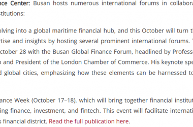 □ Z/Yen Community Newsletter September 2025 게재ㅇ 발행기관 : Z/Yen Group Limited** 현 런던금융특구시장인 Michale Mainelli가 1994년에 설립한 런던금융특구(City of London)의 씽크탱크로, 매년 전 세계 120여개 도시의 국제금융센터지수(GFCI), 국제녹색금융지수(GGFI) 등을 발표ㅇ 발행일자 : 2025. 10. 1.ㅇ 주요내용 : 부산의 글로벌 해양금융 허브 도약을 위한 디지털·해양·지속가능 선박 금융 중심 국제 포럼 개최 ㅇ뉴스원문 바로가기